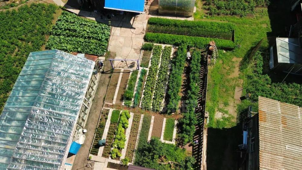 Участок благоустроен постройками и бетонными дорожками, удобными грядками и садовыми культурами.