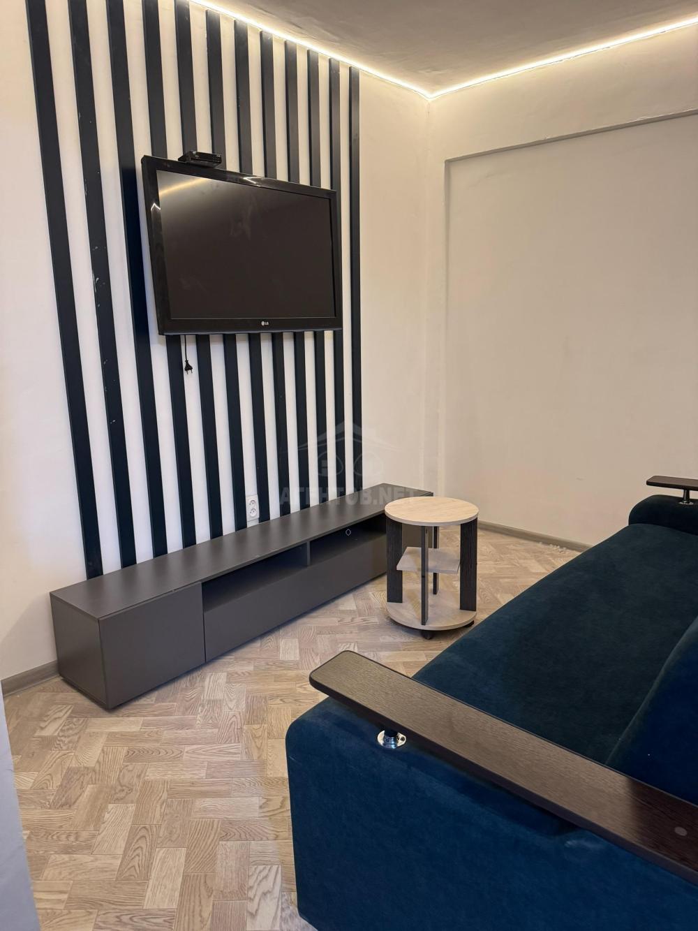 Зал: тв зона с рейками, тв тумба, телевизор, журнальный столик, в цвет реек подобран раскладной диван, установлена теплая подсветка.