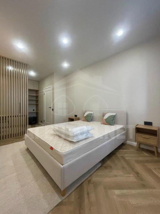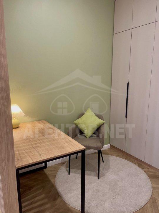 Спальня разделена на две зоны-зона для сна и рабочее место. Размер кровати 160*200, напротив расположены бра для вечернего чтения. Рабочая зона разделена перегородкой, по периметру комнаты есть большой шкаф. За чистоту квартиры отвечает робот-пылесос фирмы «Ecovacs».