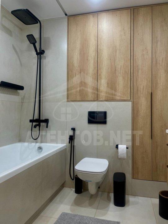 Санузел совмещен, просторный-также оснащен всем необходимым-ванна, унитаз с инсталляцией, гигиенический душ, стиральная машина и большая система хранения.