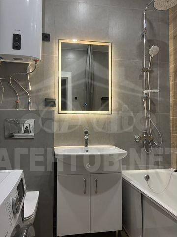 Внутри вас ждет просторная комната с качественной мебелью: вместительный шкаф и удобная кровать. Кухня оборудована современной техникой, включая холодильник и стиральную машину. Санузел совмещенный, оформлен стильно и современно.