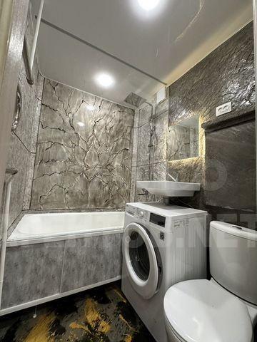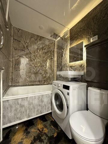 Кухня оснащена необходимой бытовой техникой, включая холодильник и стиральную машину. Ванная комната совмещенная, оформлена стильными материалами и имеет современную сантехнику.