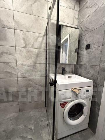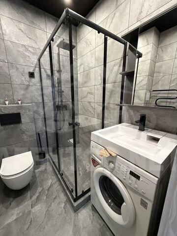 Куxня площадью 8 м² оборудована техникой, включая холодильник и плиту. В комнате установлена удобная кровать. Ванная комната совмещена и оснащена душевой кабиной и стиральной машиной.